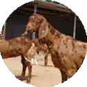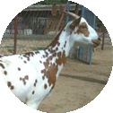 Conformation. Large animals. Variable coat colour, predominantly black or brown with white spots of differing sizes. The coat is short and lustrous. The face line is convex, with typical Roman nose but not as prominent as in Jamnapari. Ears are long and flat, curled and drooping; ear length. Both sexes have thick, medium-sized horns, carried horizontally with a slight twist directed backward and upward. Tail is small and thin. The udder is large and well developed, with large conical teats."