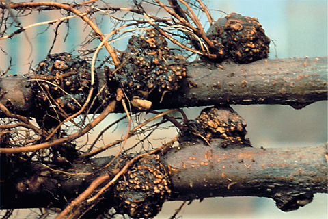 3. Galls become hard and corky on woody stems, knobby and knotty