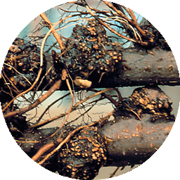 1. All above ground tissues including blossoms, fruits, shoots, branches, and in the rootstock near the graft union on the lower trunk are affected