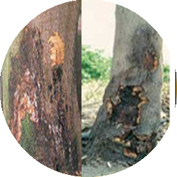 5.Reddish brown gum exudes from the bark of infected trunk. Gum exudation is considerable in sweet oranges, but relatively little in grapefruit.