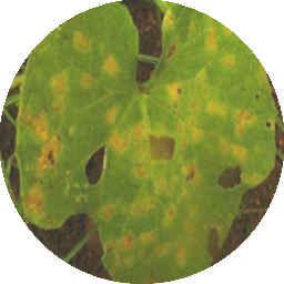 2. The corresponding lower surface of these spots shows a purplish downy growth in moist weather